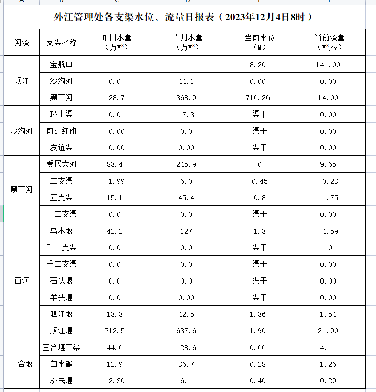 外江管理处各支渠水位、流量日报表(2023年12月4日8时)