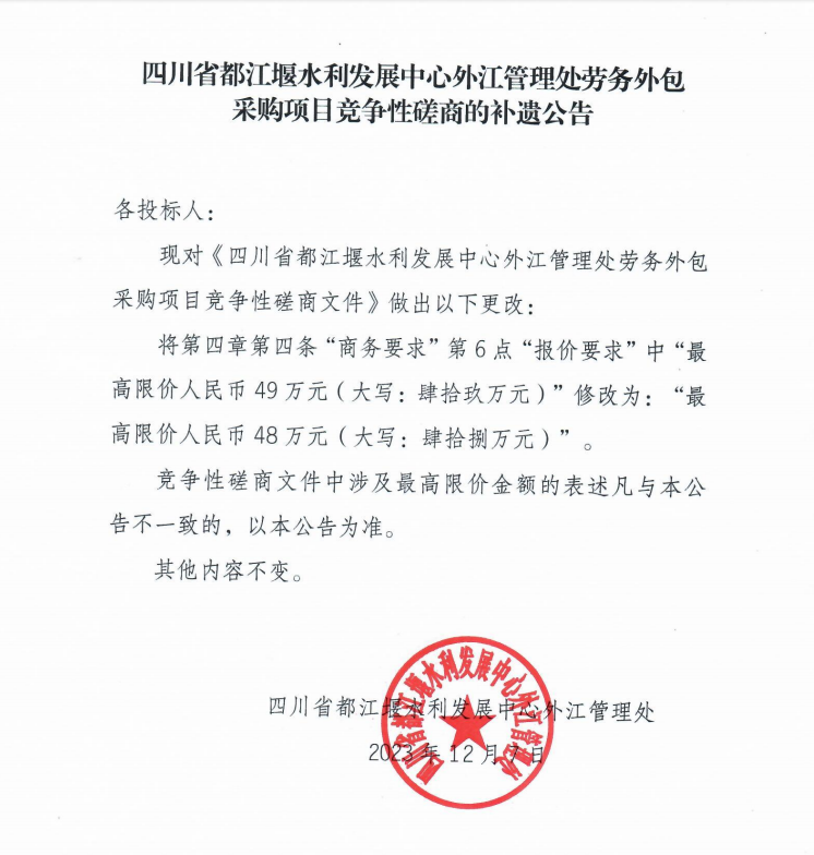四川省都江堰水利发展中心外江管理处劳务外包采购项目竞争性磋商的补遗公告