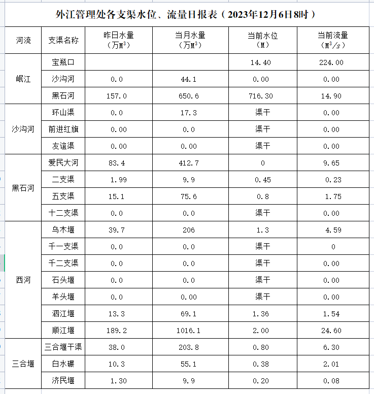 外江管理处各支渠水位、流量日报表(2023年12月6日8时)