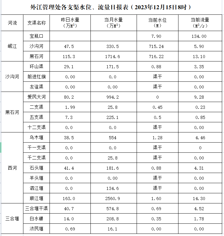 外江管理处各支渠水位、流量日报表(2023年12月15日8时)