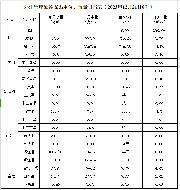 外江管理处各支渠水位、流量日报表(2023年12月21日8时)