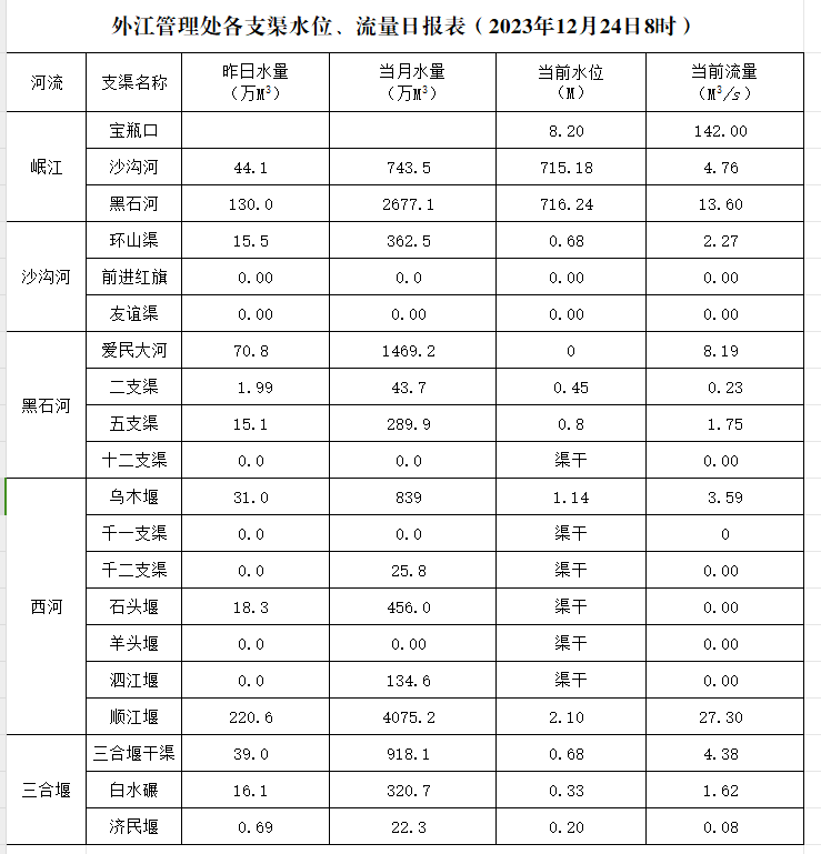外江管理处各支渠水位、流量日报表(2023年12月24日8时)