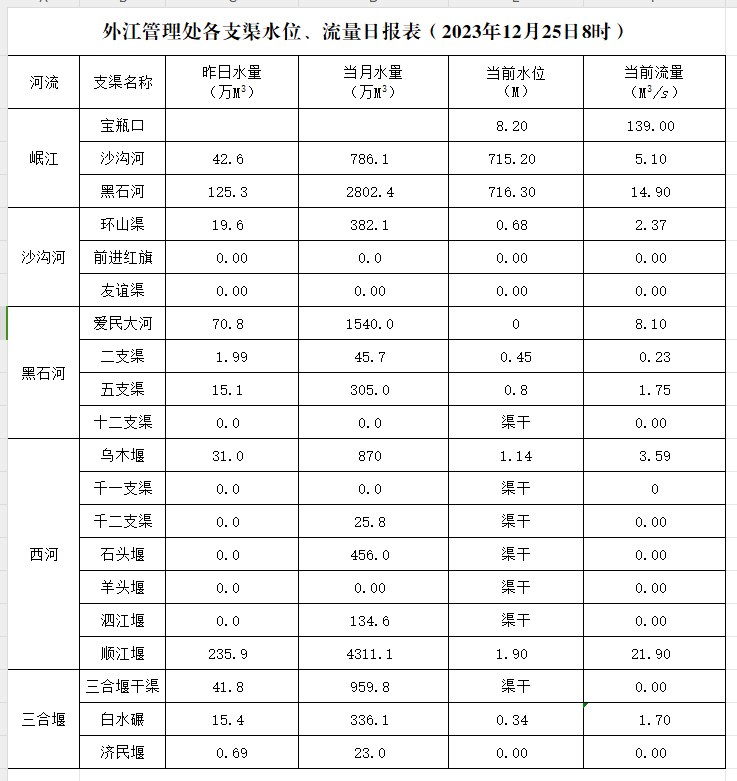 外江管理处各支渠水位、流量日报表(2023年12月25日8时)