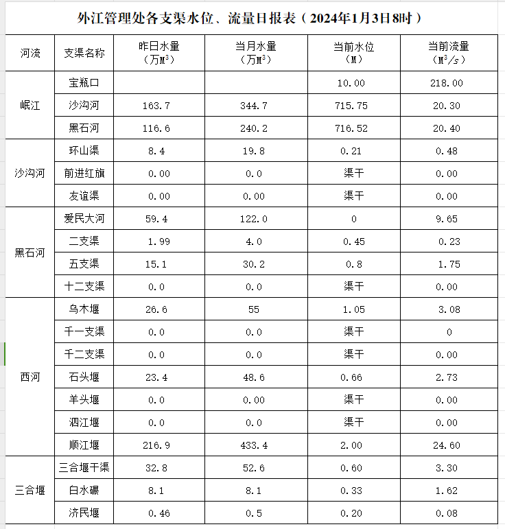 外江管理处各支渠水位、流量日报表(2024年1月3日8时)
