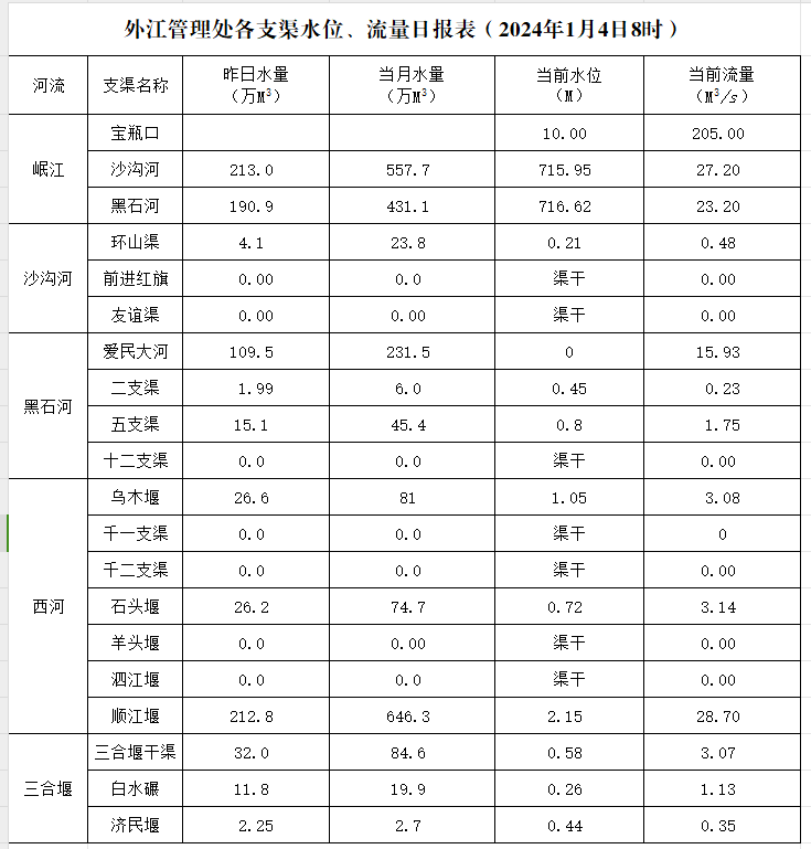 外江管理处各支渠水位、流量日报表(2024年1月4日8时)