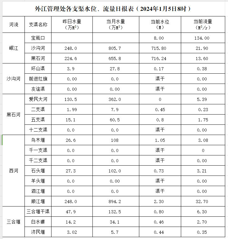 外江管理处各支渠水位、流量日报表(2024年1月5日8时)