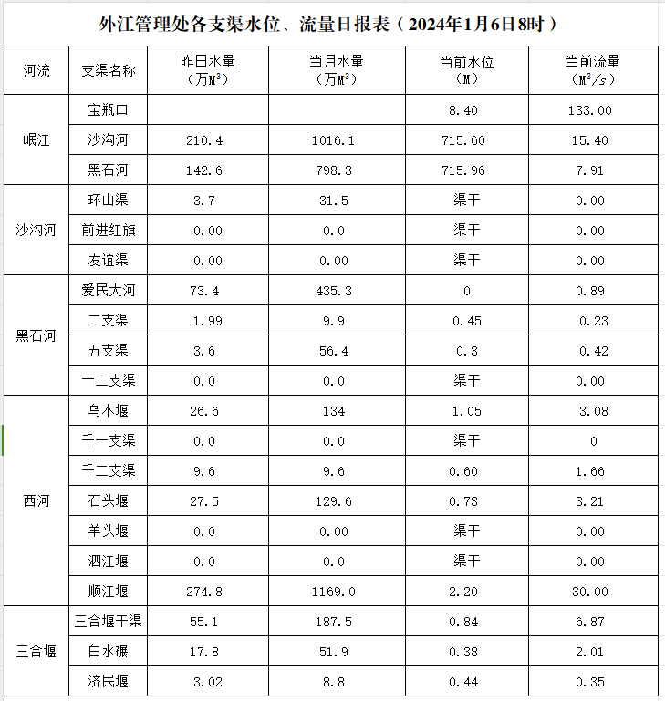 外江管理处各支渠水位、流量日报表(2024年1月6日8时)