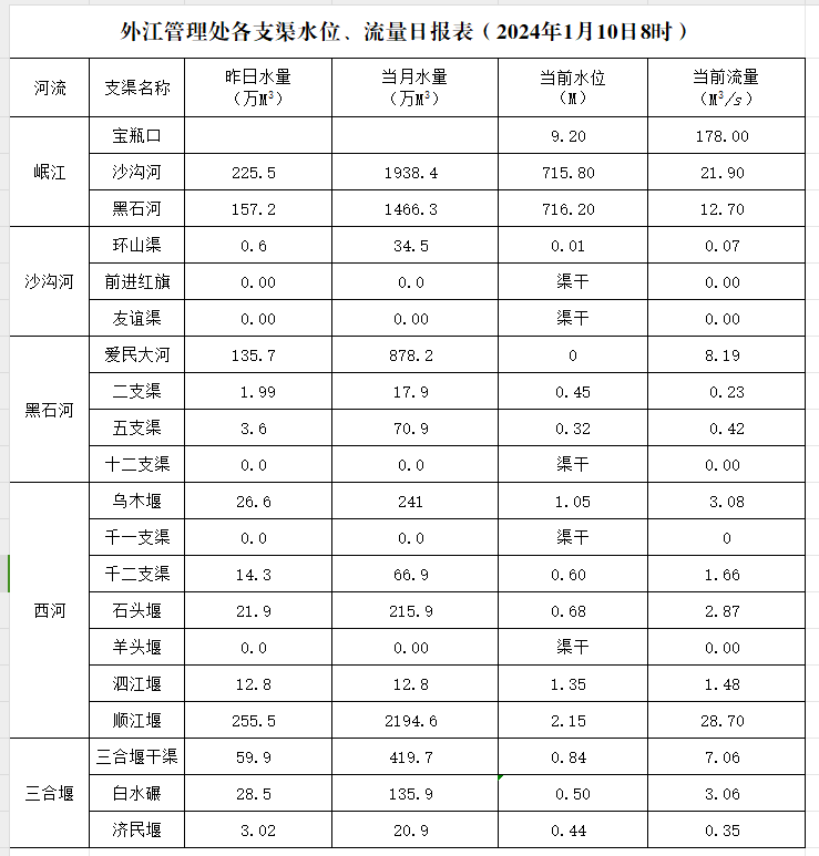 外江管理处各支渠水位、流量日报表(2024年1月10日8时)