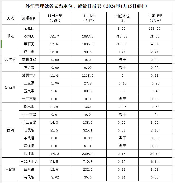 外江管理处各支渠水位、流量日报表(2024年1月15日8时)