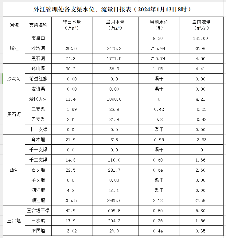 外江管理处各支渠水位、流量日报表(2024年1月13日8时)