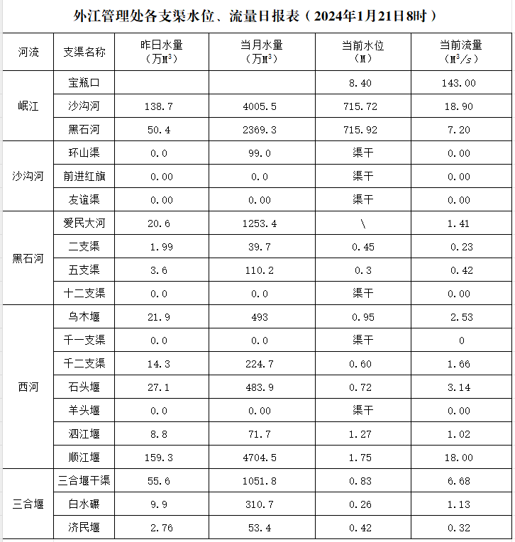 外江管理处各支渠水位、流量日报表(2024年1月21日8时)