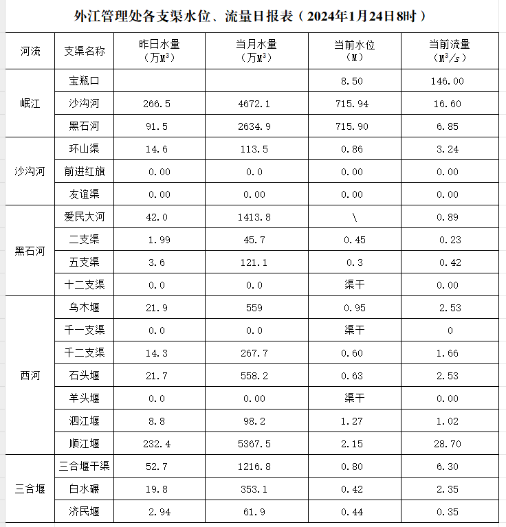 外江管理处各支渠水位、流量日报表(2024年1月24日8时)