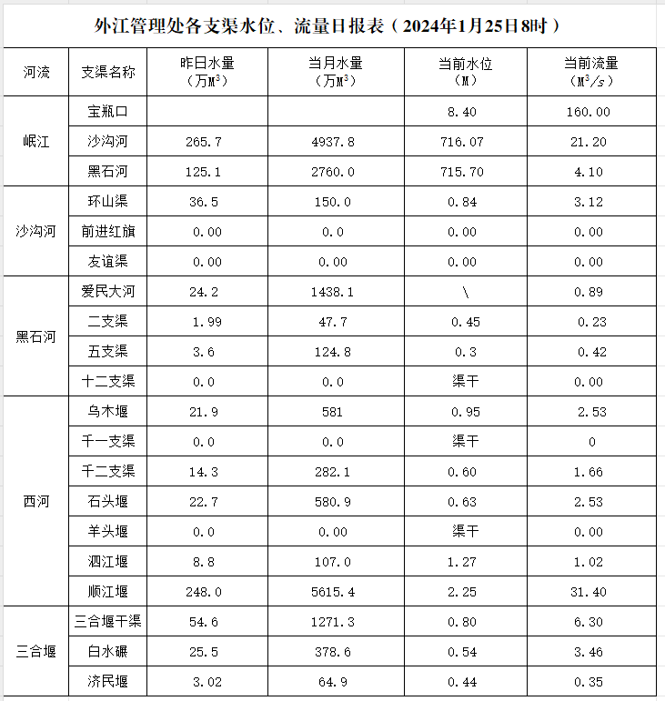 外江管理处各支渠水位、流量日报表(2024年1月25日8时)