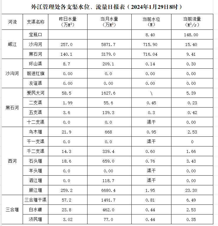 外江管理处各支渠水位、流量日报表(2024年1月29日8时)