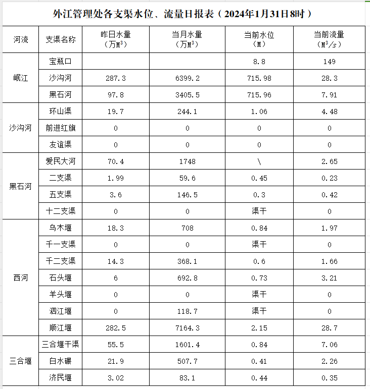 外江管理处各支渠水位、流量日报表(2024年1月31日8时)