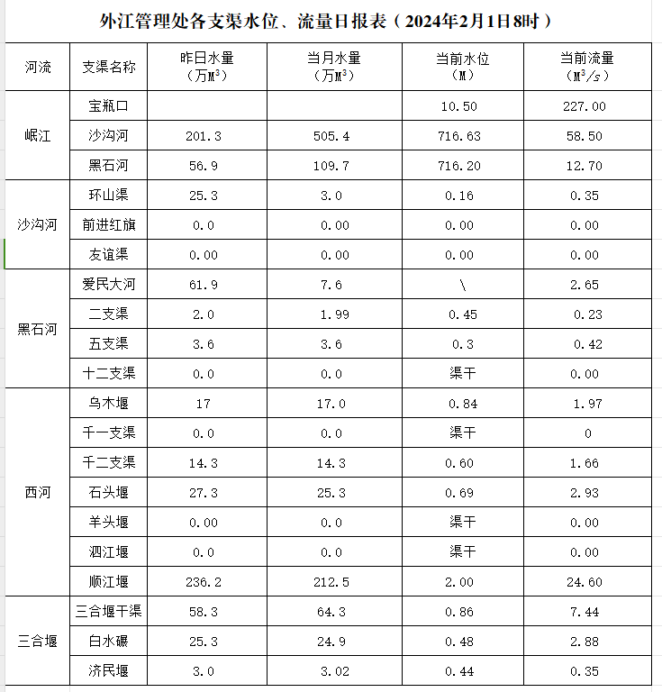 外江管理处各支渠水位、流量日报表(2024年2月1日8时)