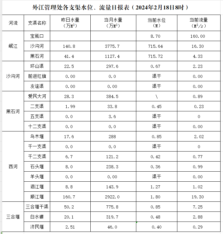 外江管理处各支渠水位、流量日报表(2024年2月18日8时)