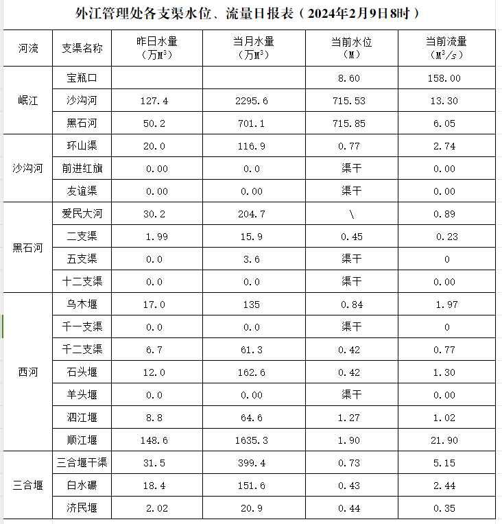 外江管理处各支渠水位、流量日报表(2024年2月9日8时)