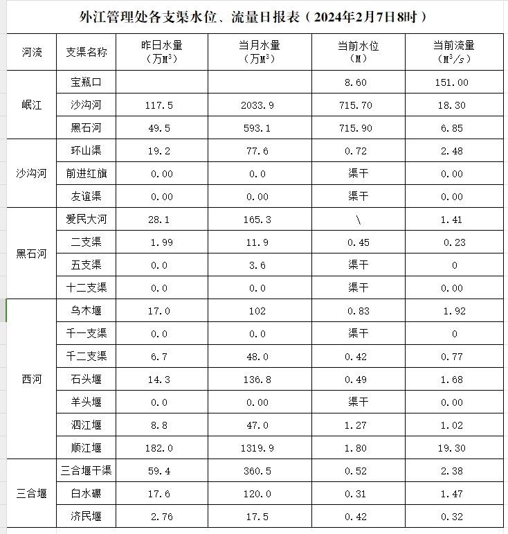 外江管理处各支渠水位、流量日报表(2024年2月7日8时)