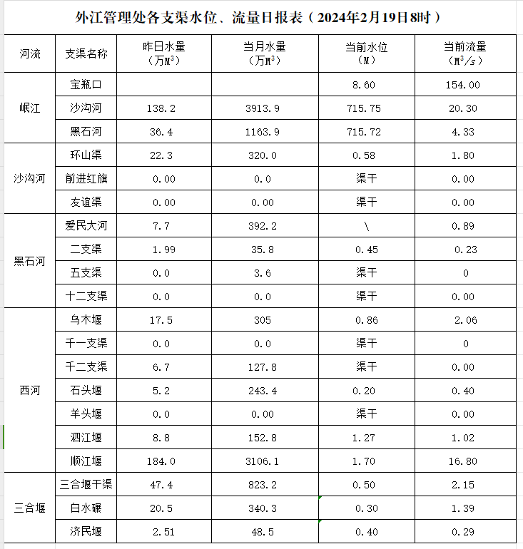 外江管理处各支渠水位、流量日报表(2024年2月19日8时)