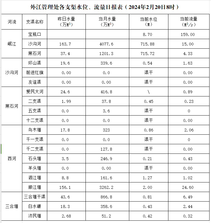 外江管理处各支渠水位、流量日报表(2024年2月20日8时)