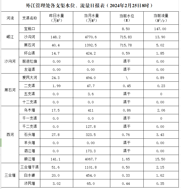 外江管理处各支渠水位、流量日报表(2024年2月25日8时)
