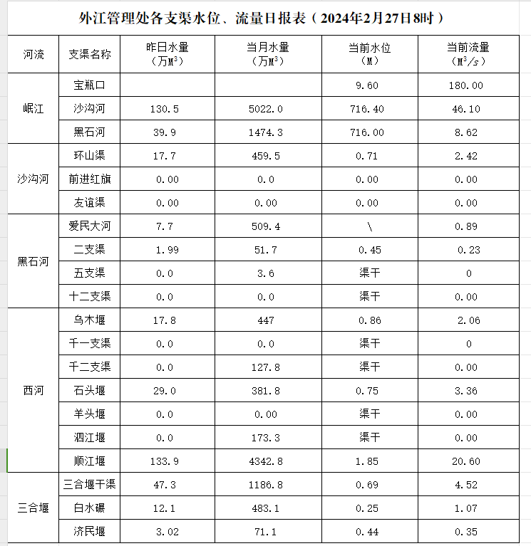 外江管理处各支渠水位、流量日报表(2024年2月27日8时)