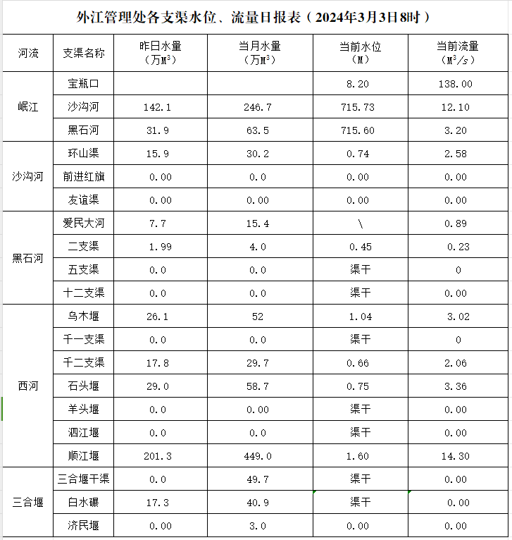 外江管理处各支渠水位、流量日报表(2024年3月3日8时)