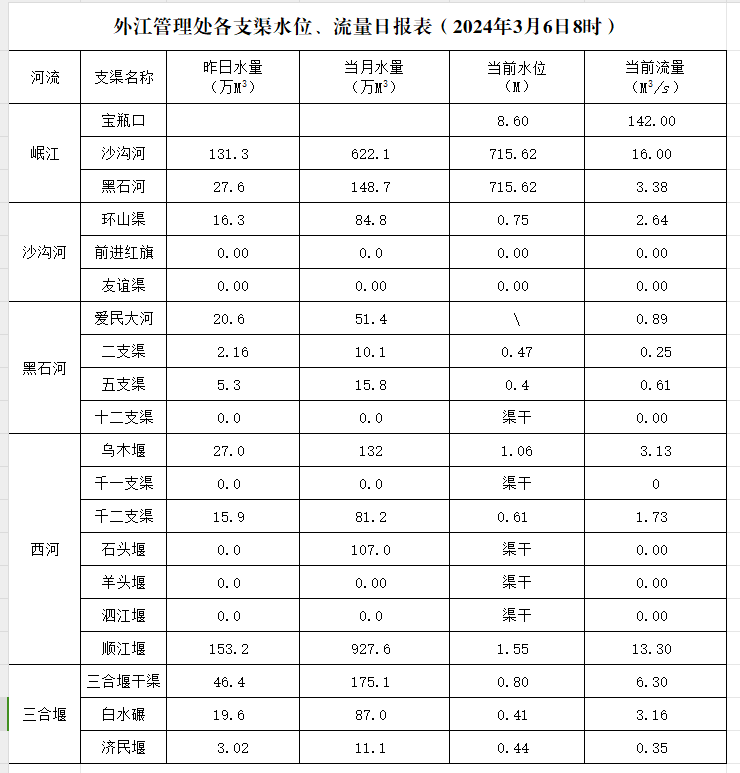 外江管理处各支渠水位、流量日报表(2024年3月6日8时)