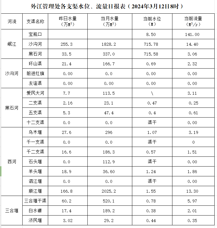外江管理处各支渠水位、流量日报表(2024年3月12日8时)