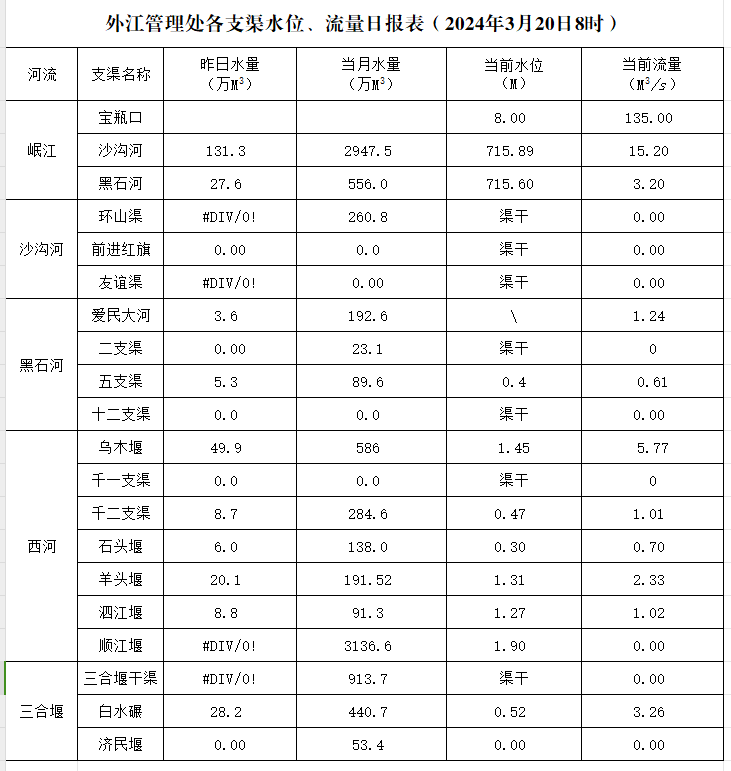 外江管理处各支渠水位、流量日报表(2024年3月20日8时)