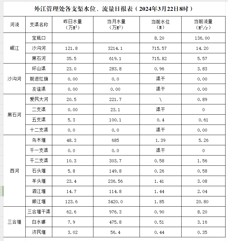 外江管理处各支渠水位、流量日报表(2024年3月22日8时)