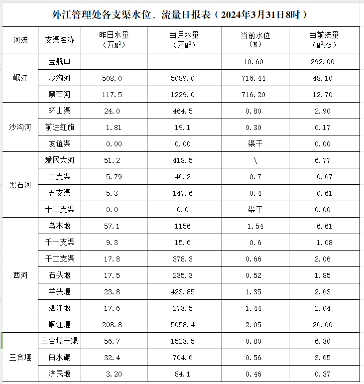 外江管理处各支渠水位、流量日报表(2024年3月31日8时)