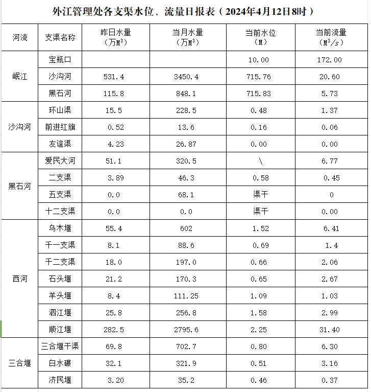 外江管理处各支渠水位、流量日报表(2024年4月12日8时)