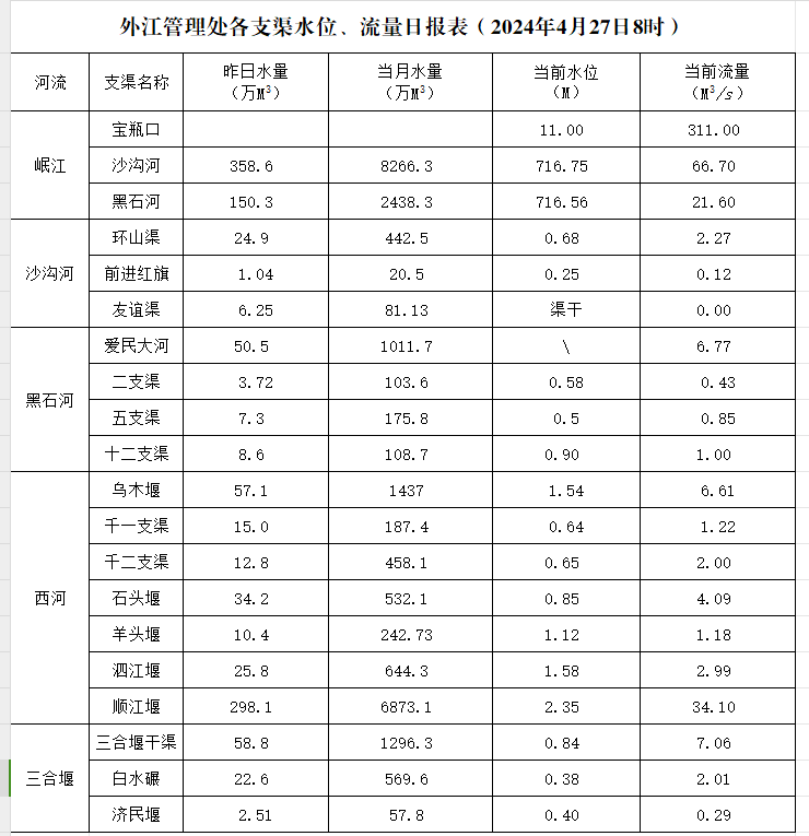 外江管理处各支渠水位、流量日报表(2024年4月27日8时)