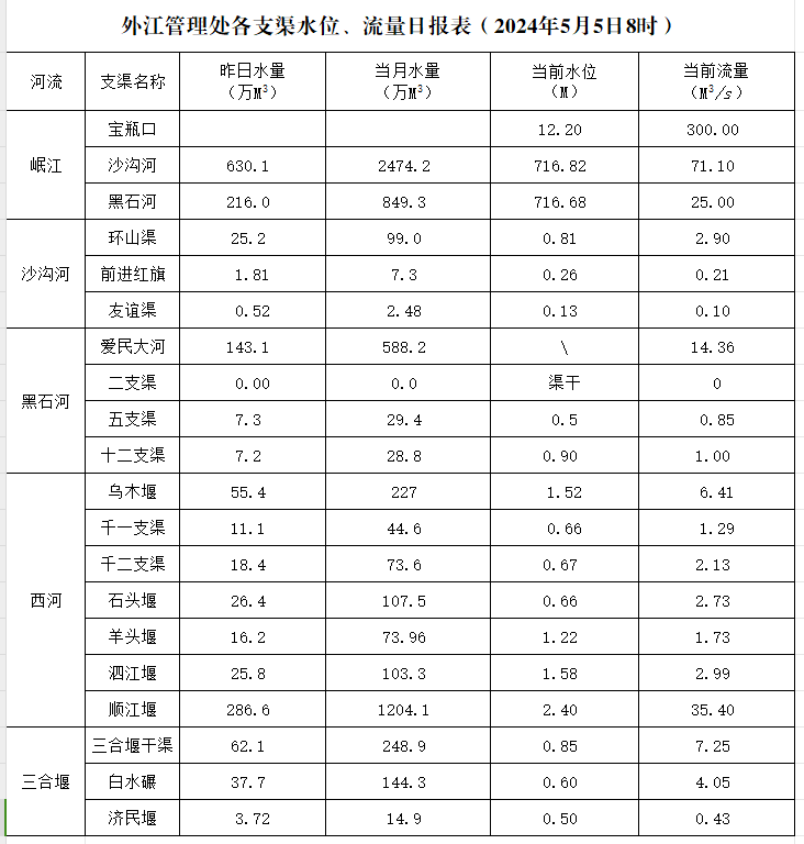 外江管理处各支渠水位、流量日报表(2024年5月5日8时)