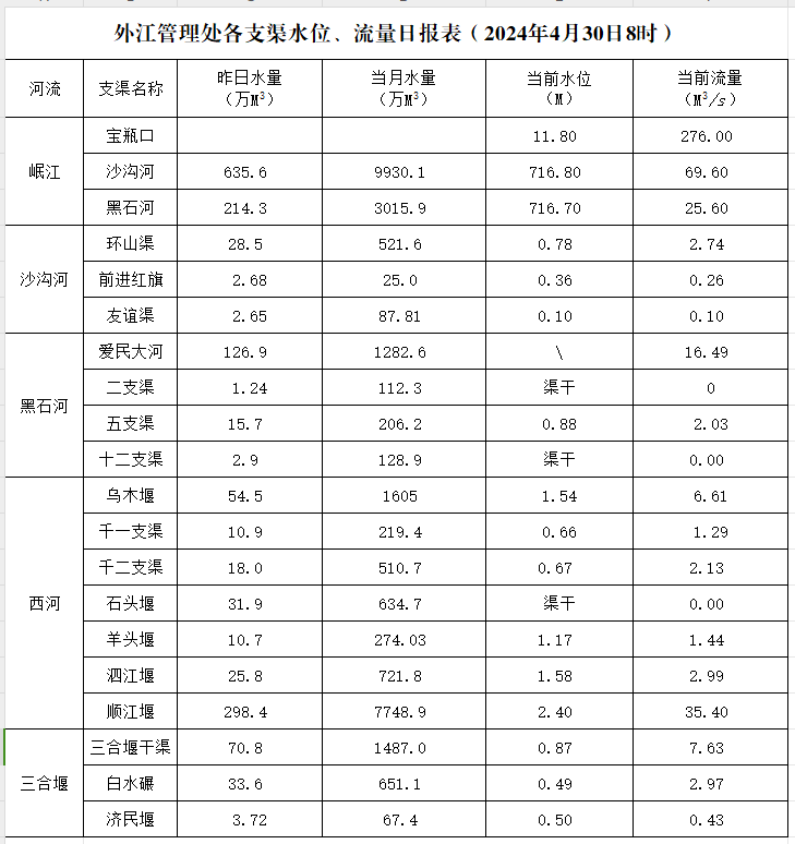 外江管理处各支渠水位、流量日报表(2024年4月30日8时)
