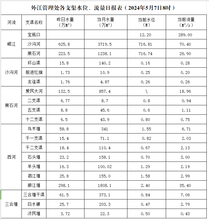 外江管理处各支渠水位、流量日报表(2024年5月7日8时)