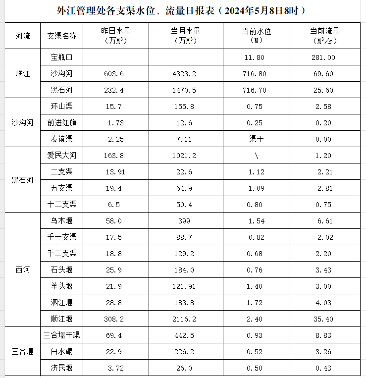 外江管理处各支渠水位、流量日报表(2024年5月8日8时)