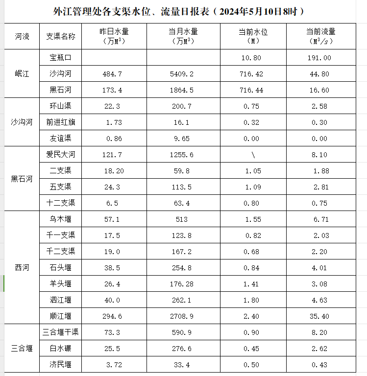 外江管理处各支渠水位、流量日报表(2024年5月10日8时)
