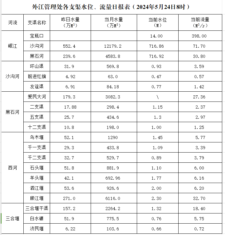 外江管理处各支渠水位、流量日报表(2024年5月24日8时)