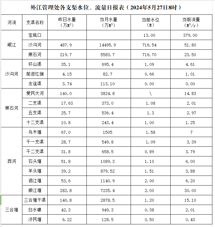 外江管理处各支渠水位、流量日报表(2024年5月27日8时)