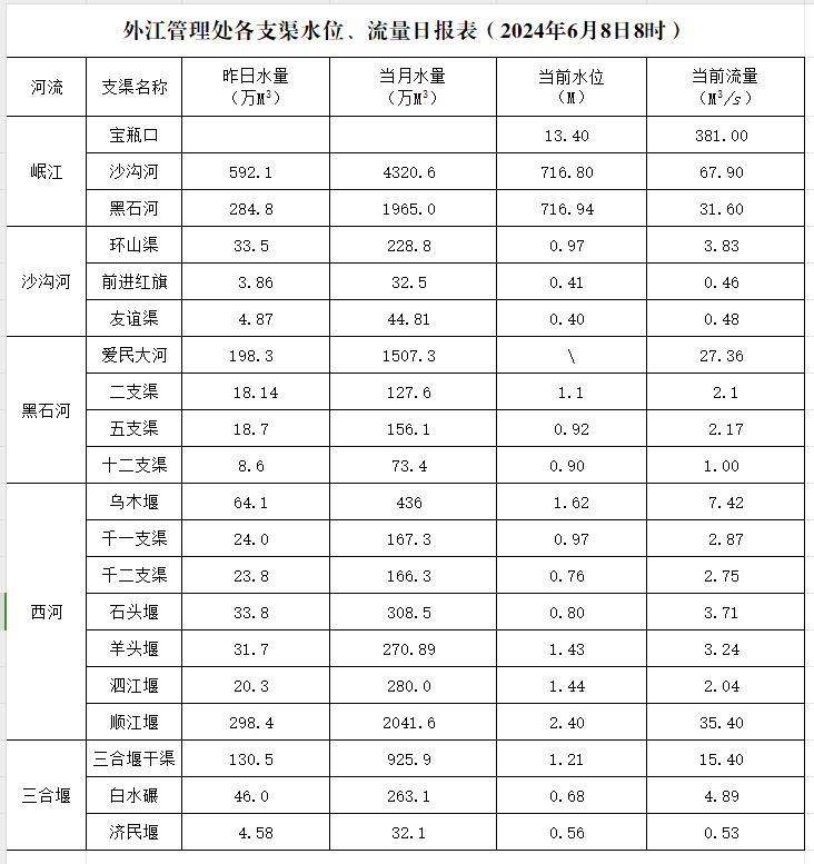 外江管理处各支渠水位、流量日报表(2024年6月8日8时)
