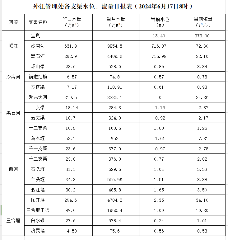外江管理处各支渠水位、流量日报表(2024年6月17日8时)