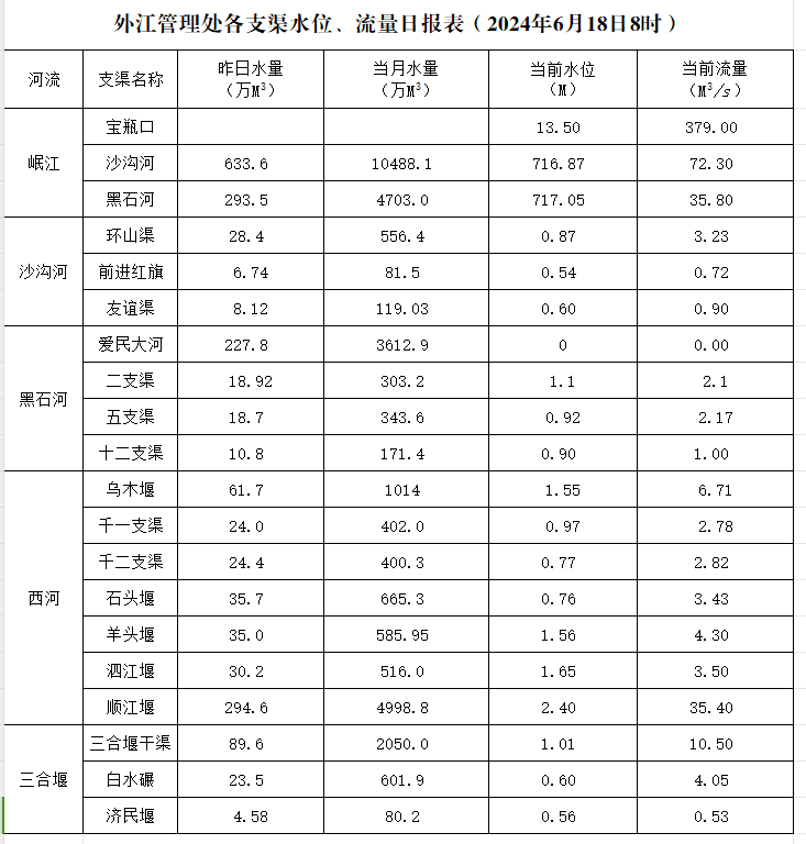 外江管理处各支渠水位、流量日报表(2024年6月18日8时)