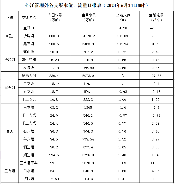 外江管理处各支渠水位、流量日报表(2024年6月24日8时)