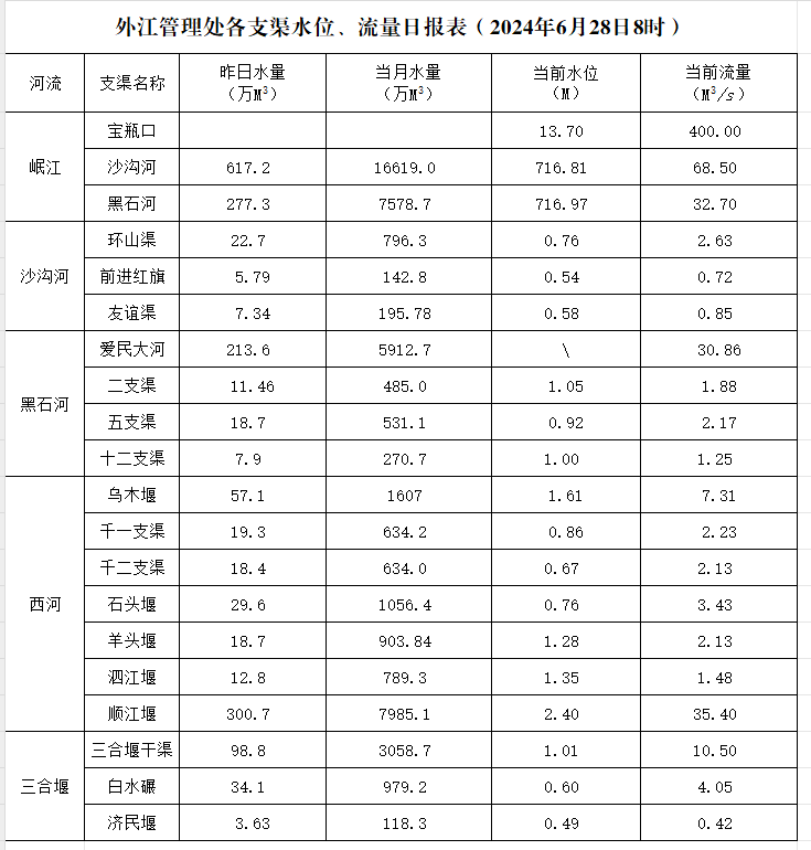 外江管理处各支渠水位、流量日报表(2024年6月28日8时)