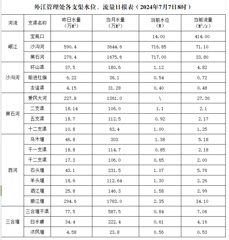 外江管理处各支渠水位、流量日报表(2024年7月7日8时)