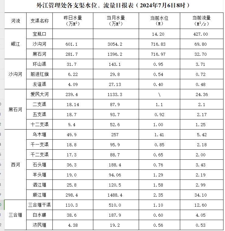 外江管理处各支渠水位、流量日报表(2024年7月6日8时)