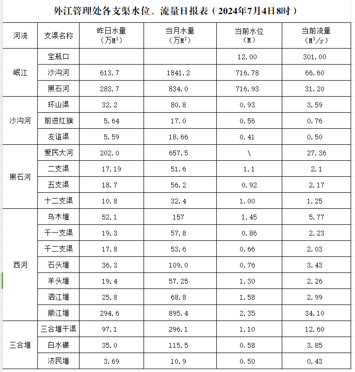 外江管理处各支渠水位、流量日报表(2024年7月4日8时)